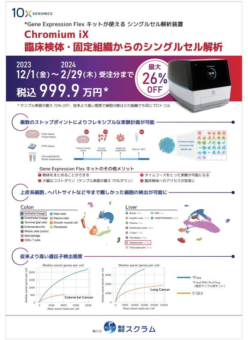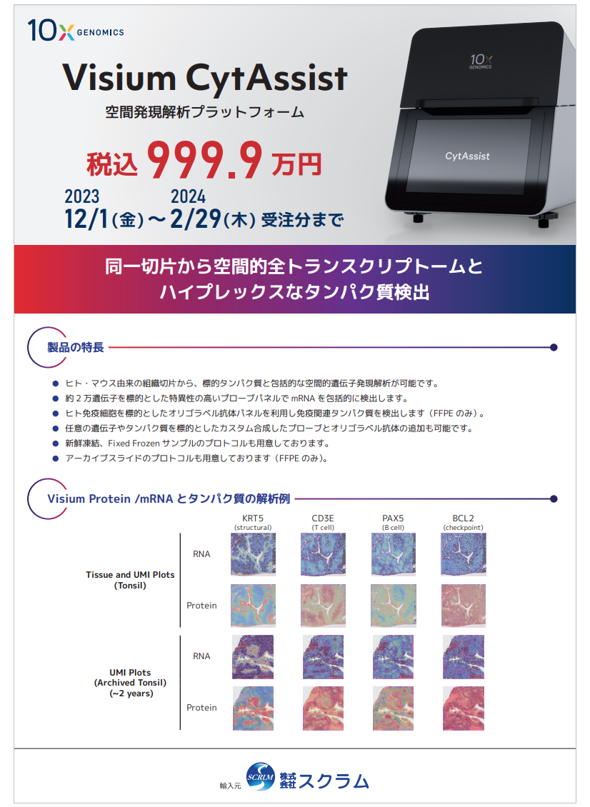 シングルセル解析装置のChromium iXと、空間発現解析プラットフォームのVisium CytAssistが、2023年12月1日よりお得な価格で登場します。