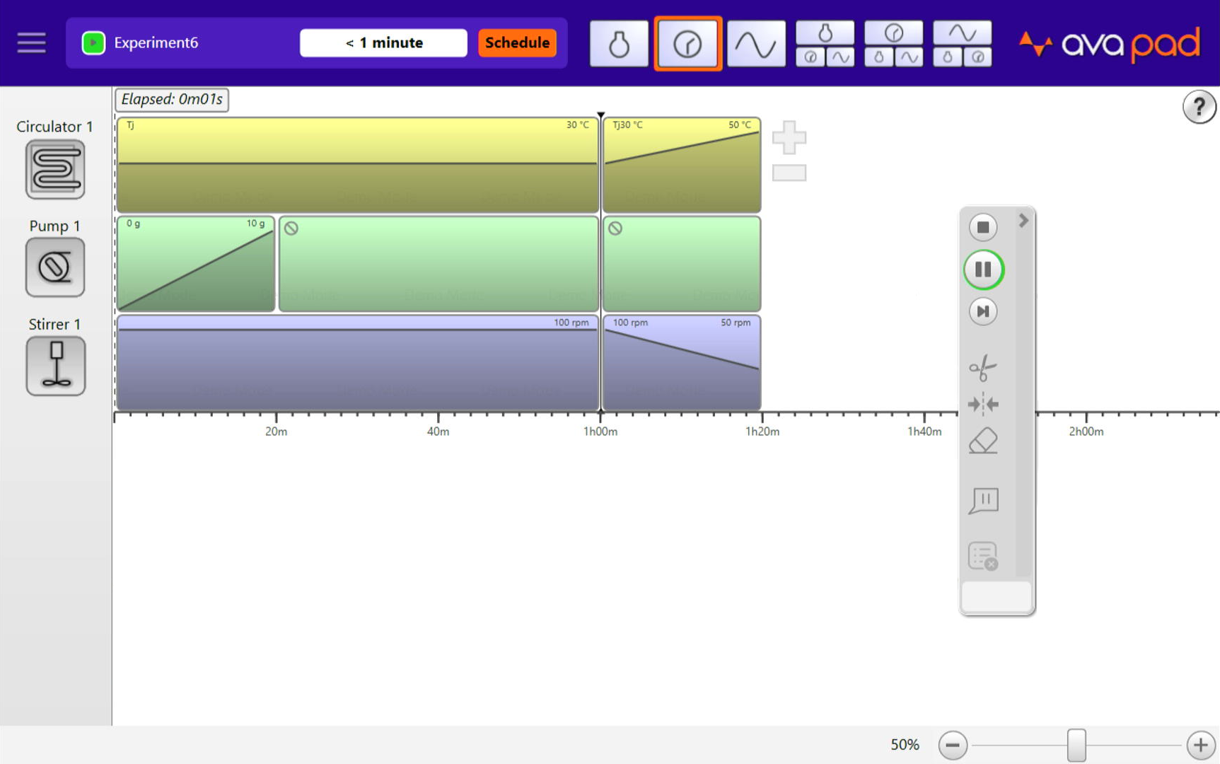 温度・撹拌・滴下・真空・センサーなど、複数の実験装置を一括で管理し、設定したプロトコルに従って反応を自動的に進行させることができます。